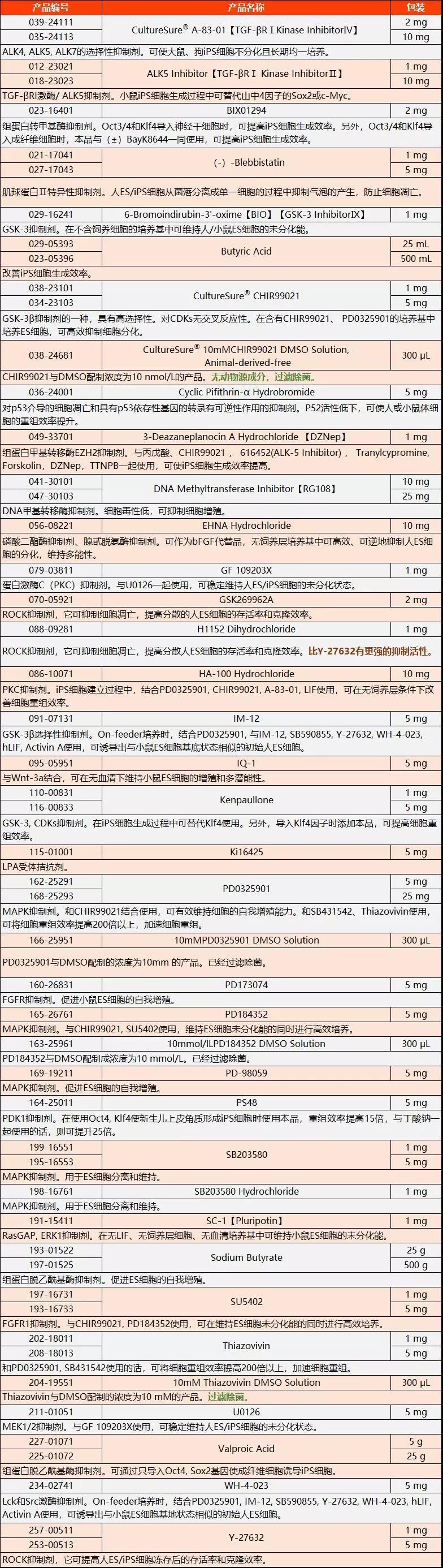 小分子化合物在ES/iPS细胞未分化维持中的作用 Wako提供大量ES/iPS未分化维持、分化诱导相关的小分子化合物,推出CultureSure® A419259、三盐酸化物和CKl-7二盐酸化物,MF 、CultureSure® KY03-Ⅰ等新品。 ※ 仅供实验使用,不可用于临床诊断。