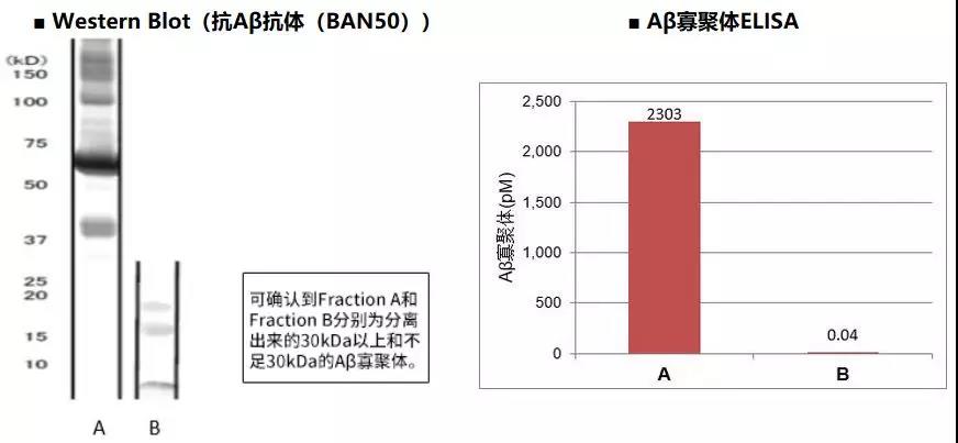 将Aβ1-42冷藏于4℃并孵育一晚后,通过超滤将不足30kDa(8聚体以下)和大于等于30kDa(九聚体以上)的Aβ寡聚体分离,分别把回收到的片段进行Western Blot和本ELISA检测。