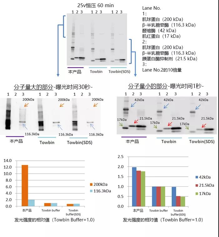 恒压条件下的AquaBlot™ 10×高效率转膜buffer,无论是在分子量大的部分还是分子量小的部分都显示出比Towbin以及Towbin(SDS) buffer更高的转膜效率。