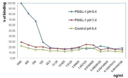 图:PSGL-1 (human):Fc (human) (rec.) (产品编号:AG-40B-0190)仅在酸性pH下与其配体VISTA结合。