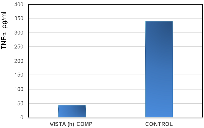 方法:包被抗CD3(人)(2.5 µg/mL)以激活人CD4+ T细胞,并将其与VISTA (human):COMP (mouse) (rec.) (His)或对照蛋白(产品编号:AG-35B-0007)(包被10 µg/mL)孵育5天。使用Cymax™ TNF-α(human)ELISA Kit(产品编号:YIF-LF-EK0193)从细胞上清液中测量人类TNF-α。