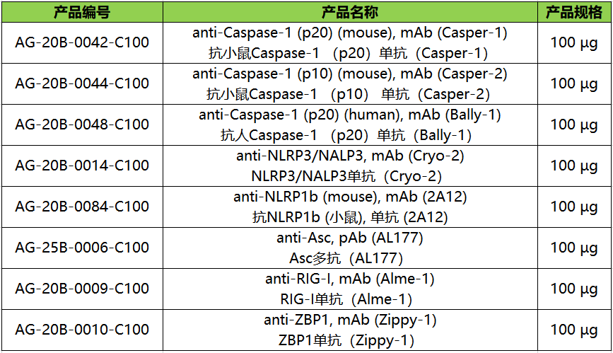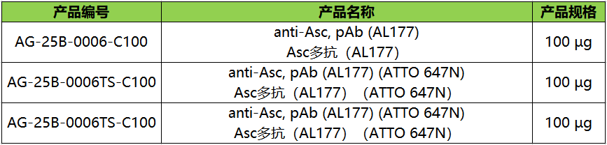 AdipoGen Life Sciences推出的抗Asc多抗(AL177)是用于Western blotting检测Asc的标准抗体。它还可用于免疫荧光和流式细胞术检测Asc斑点的形成,从而检测体内炎症小体的激活。