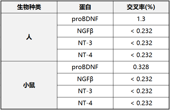 与人proBDNF的交叉率为1.30%,与小鼠proBDNF的交叉率为0.328%。