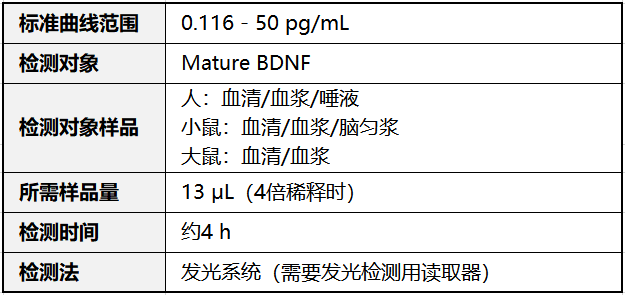 BDNF的前体proBDNF经加工,成为Mature BDNF(mBDNF)。据报告,proBDNF和mBDNF拥有不同的生理活性,因此,区分和检测每种BDNF非常重要。