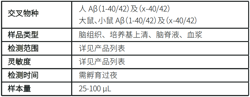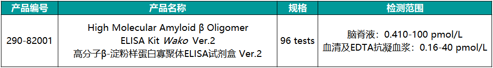 研究表明,可溶性形式的高分子β-淀粉样蛋白寡聚体(Aβ Oligomer)可诱导参与阿尔茨海默病病理生理的有害级联反应。高分子 Aβ寡聚体的 Aβ*56(12-mer)对记忆损伤的影响极大 。高分子β-淀粉样蛋白寡聚体ELISA试剂盒Ver.2可以特异性地对9-mer以上的寡聚体进行检测,与1~8-mer的寡聚体几乎不发生反应。