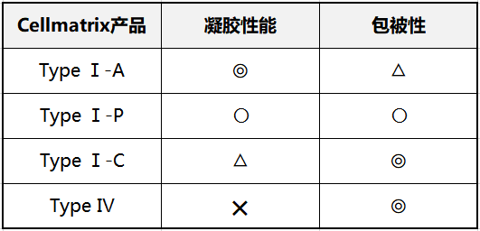 ● Cellmatrix系列产品的黏度以及凝胶性能各有不同。如计划使用胶原蛋白包埋法进行培养,建议使用凝胶性能高的产品。而黏度越低的产品则越容易进行处理,适合用于包被培养。下方表格整理了各产品的特点以供参考。