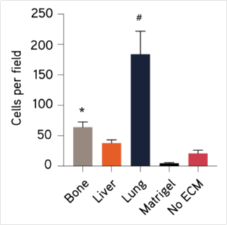 乳腺癌细胞(BT-549)通过Transwell membrane(孔径:8 μm),在TissueSpec™ 骨/肝/肺 ECM水凝胶和C公司表现出明显不同的迁移量。