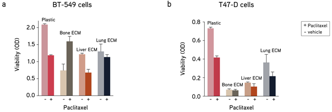 使用不同组织特异性ECM(TissueSpec™ 骨/肝/肺 ECM 水凝胶)作为培养基质,可观察到乳腺癌细胞 (a) BT-549 和 (b) T47-D 对抗癌药物(Paclitaxel:5 μM)或Vehicle(DMSO)的敏感性有着显著差异。该结果表明癌细胞对药物的敏感性因转移部位而异。