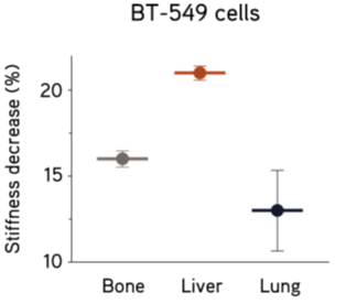 在TissueSpec™ 骨/肝/肺 ECM 水凝胶接种乳腺癌细胞BT-549(6 x 105个细胞) 48 h后,均出现不同程度的弹性降低。