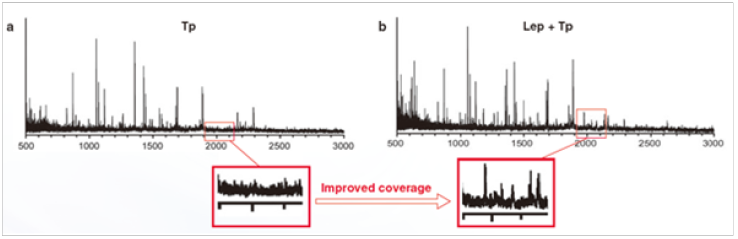 胰蛋白酶 (Tp)( 图 a) 和赖氨酰肽链内切酶 (Lys-C)+Tp ( 图 b) 酶切后的质谱结果对照图。