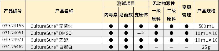 ※ 因CultureSure® DMSO的物理性质无法进行支原体测试,所以无法保证支原体阴性。但可以使用0.1 μm的过滤器去除支原体。