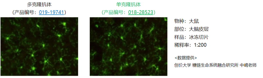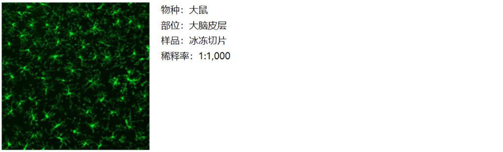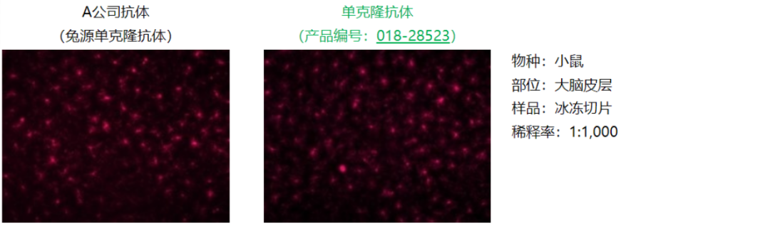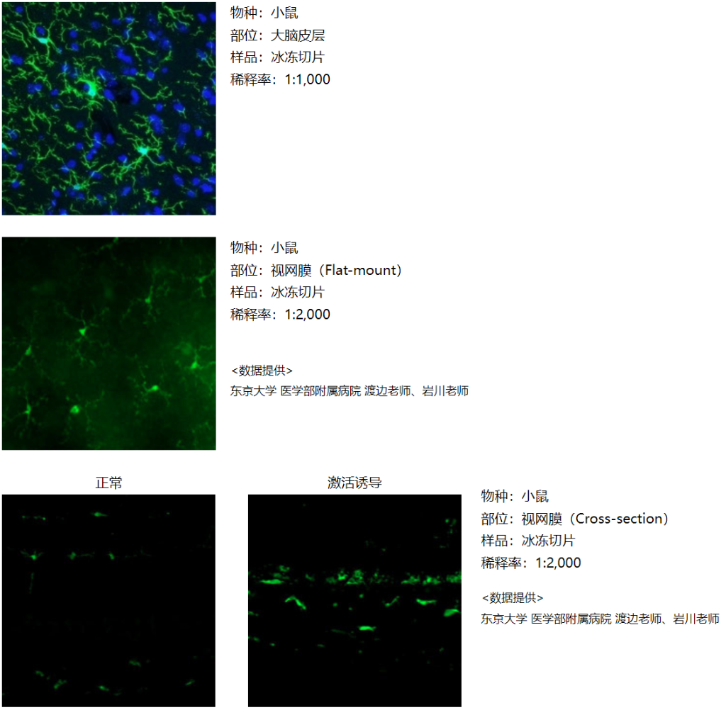 抗Iba1, 重组兔源单克隆抗体(6A4),是针对小胶质细胞标记分子Iba1的兔源单克隆抗体。可获得与小胶质细胞标记物标准抗体Iba1兔多抗(产品编号:019-19741)相同的染色图像。此外,在小鼠视网膜的免疫组织染色中也取得了良好的效果。