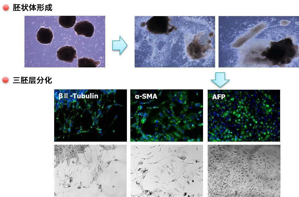 使用StemSure®系列的培养基驯化培养了使用StemSure® hPSC培养基Δ培养的人iPS细胞201B7株。胚状体形成后,通过检测βⅢ-Tubulin、α-SMA、AFP的表达确认三胚层分化。