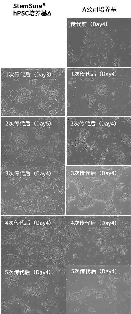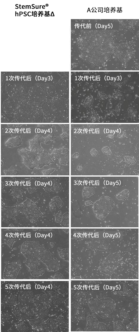 在StemSure® hPSC培养基Δ中培养的人iPS细胞的细胞形态与A公司培养基培养的几乎相同,也没有观察到趋向分化的形态,可实现稳定培养。
