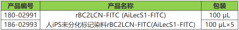 可特异性识别未分化细胞的重组凝集素,用FITC将rBC2LCN标记。rBC2LCN是来源于洋葱伯克霍尔德菌(Burkholderia cenocepacia),BC2L-C的N末端结构域在大肠杆菌中表达的重组凝集素。BC2LCN可特异性识别存在于人ES·iPS细胞表面的糖链。本产品已用FITC进行荧光标记,直接使用合适的浓度与含ES·iPS细胞的培养液混合,即可在活细胞状态下进行分析。另外,即使是在与本产品共存的条件下持续培养数天,也未发现有细胞毒性。本产品可用于细胞染色、流式细胞术(激发波长=495 nm,发射波长=520 nm)。