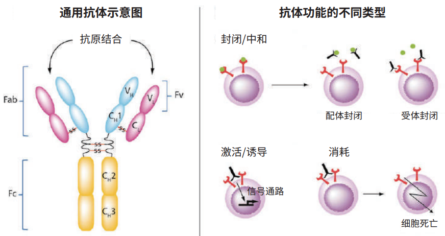 抗体是高度特异性且自然进化的分子,可识别并消除致病和疾病抗原。典型的抗体由两个抗原结合片段(Fabs)组成,它们通过柔性区域(铰链)连接到恒定的Fc区。该结构包括两对多肽链,每对包含不同大小的重链和轻链。Ig的Fc区用于结合免疫系统的各种效应分子以及决定抗体的生物分布的分子。