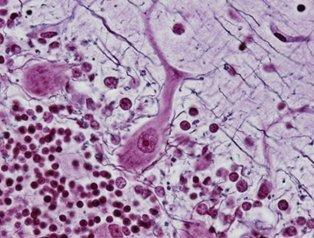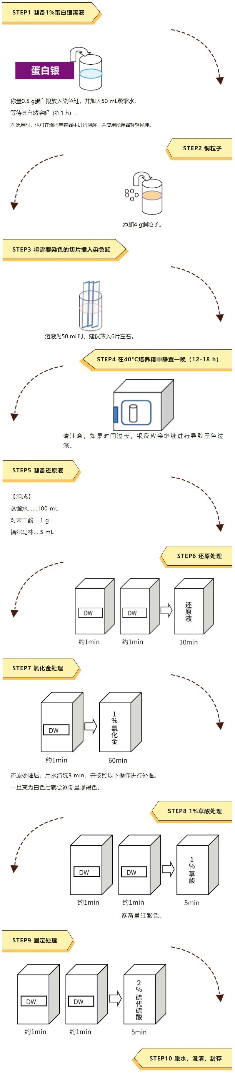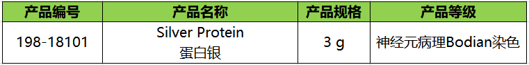 神经元病理染色试剂——蛋白银 病理学特殊染色:可用于Bodian染色的蛋白银。 神经退行性疾病组织学染色具有以下特征,老年斑:红紫色(淀粉样蛋白核心:红色)、神经原纤维缠结:神经原纤维缠结(红色~黑紫色)、匹克小体(匹克氏病):红褐色。 外观:微褐色~褐色,结晶性粉末~粉末或块状物 ◆染色示例 图1. 小脑 轴突(黑色)、 浦肯野细胞(红紫色)、 粒细胞(红紫色) 图2. 大脑 老年斑(红紫色)和淀粉样蛋白核心(红色) 图3. 大脑 神经元纤维变化 (箭头:红紫色 红褐色) 图4. 大脑(匹克氏病) 匹克小体(箭头:红褐色) 染色状态 轴突:黑色 浦肯野细胞、颗粒层(小脑):红紫色 小脑皮层:浅紫色 神经退行性疾病组织学特征 老年斑:红紫色(淀粉样蛋白核心:红色) 神经原纤维缠结:神经原纤维缠结(红色~黑紫色) 匹克小体(匹克氏病):红褐色 ◆染色方法示例 Bodian染色法概要 Bodian染色实验步骤 注意事项 1. 可使用标准方法染色,但应避免长时间的银反应。 2. 良好的染色效果会受温度和时间的影响,因此,请根据研究机构考虑适合的条件。 3. 根据固定效果依次排序固定条件:酸性福尔马林 > 中性缓冲福尔马林 > 多聚甲醛,延长固定时间预计不会影响染色效果。 ◆产品列表 ※ 仅供实验研究用,不可用于临床诊断。 Prev Next