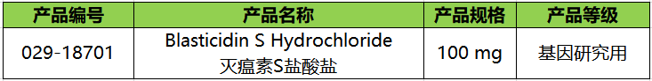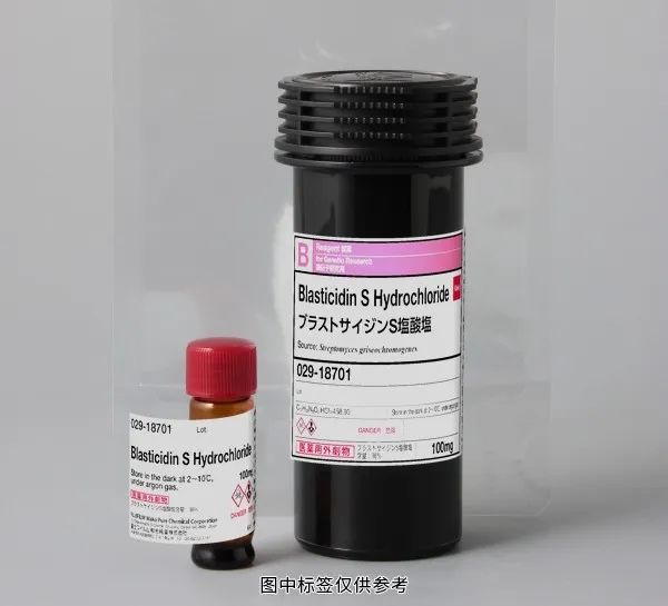转染细胞筛选工具——灭瘟素S盐酸盐 灭瘟素是一种作用于原核生物和真核生物的核苷类抗生素,可抑制原核生物和真核生物的蛋白质合成。 在基因工程研究中,灭瘟素S可用于筛选携带bsr或bsd抗性基因的大肠杆菌或哺乳动物细胞的转染细胞。 ◆产品概要 规格含量:98.0+% (HPLC) 储存条件:冷藏(低温运输) CAS RN® : 3513-03-9 分子式 : C17H26N8O5・HCl 分子量 : 458.90 别名:杀稻瘟菌素S盐酸盐 抗性基因 细菌来源:bsr 霉菌来源:bsd 用途 筛选转染细胞 使用浓度 大肠杆菌:50~100 μg/mL(请使用Low Salt LB培养基) 哺乳动物细胞:2~10 μg/mL (建议根据实验确定不同类型的细胞最佳使用浓度) ◆物理特性 外观:白色~接近白色,结晶型粉末~粉末 来源:Streptomyces griseochromogenes 溶解性:可溶于水 ◆产品列表 ※ 仅供实验研究用,不可用于临床诊断。 Prev Next