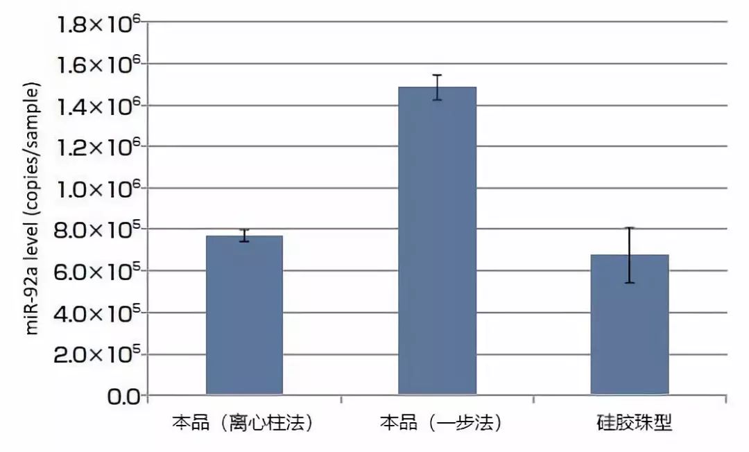 通过qPCR对miR-92a进行定量,比较使用本品以及硅胶珠型产品从200 μL大鼠血浆中提取到的microRNA量。本品的离心柱法具有与硅胶珠型产品几乎同样的microRNA提取能力,而一步法的microRNA提取能力比硅胶珠型产品更好(图3)。