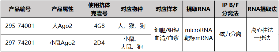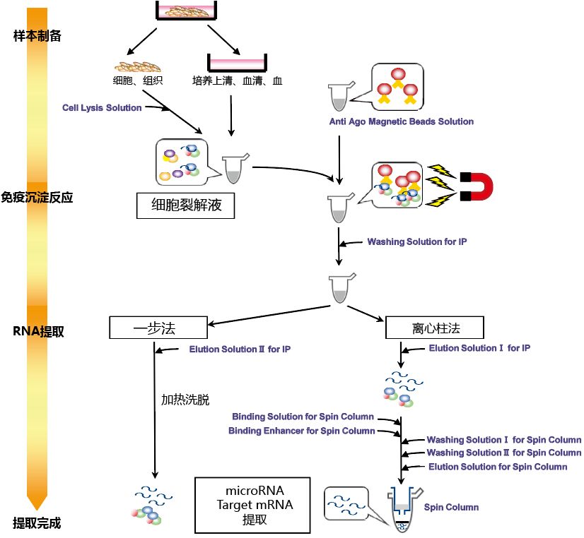 试剂盒采用磁珠法,可进行简易的免疫沉淀操作并获得良好的重复性。免疫沉淀后提取的RNA可进一步使用离心柱纯化,获得高纯度的RNA。若使用含有抗Ago抗体固定化磁珠的试剂盒,也可使用一步法更加简便地提取RNA(备注:RNA与磁珠不分离)。