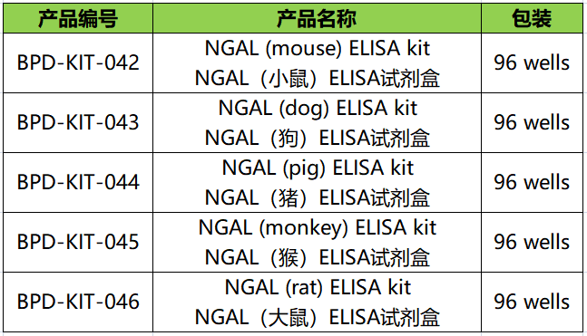 除NGAL (人) ELISA试剂盒外,另可提供小鼠、大鼠、猪、狗、猴的 NGAL ELISA 试剂盒。