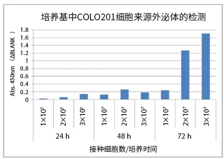 在T75细胞培养瓶中接种1×107、2×107、3×107的COLO201细胞,培养72 h。每24 h回收一部分的培养上清样品,用PS Capture™ 外泌体ELISA试剂盒(抗小鼠IgG POD)和试剂盒配套的Control Primary Antibody Anti CD63 (100×) 进行CD63的吸光度检测。