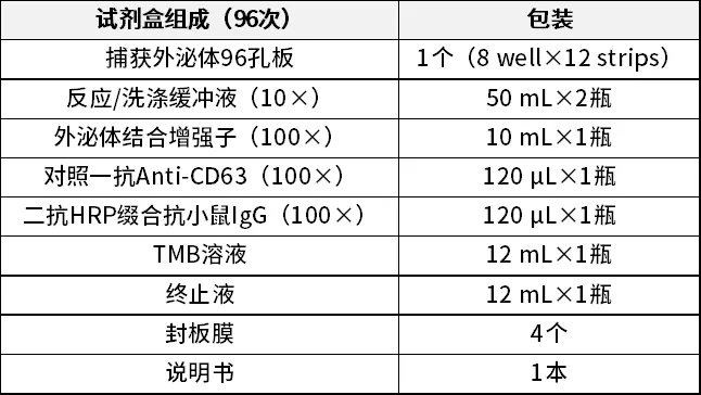 本试剂盒是可以定性分析细胞培养上清和体液样品中提取的细胞外囊泡,以及定量分析细胞培养上清样品中的细胞外囊泡的ELISA试剂盒。让细胞外囊泡表面的磷脂酰丝氨酸(PS)特异性结合的蛋白在固定化的板上与细胞外囊泡反应并固定后,用任意细胞外囊泡表面标记蛋白的小鼠单抗作为检测一抗,试剂盒中的HRP标记抗小鼠IgG抗体为二抗,可高灵敏度检测表面具有任意标记蛋白的细胞外囊泡。