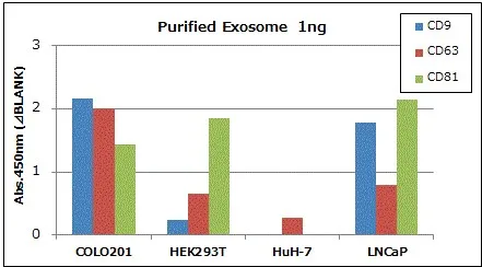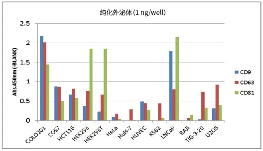 将1 ng从各种细胞培养上清中提取的细胞外囊泡添加至孔中,使用能识别表面标记蛋白CD9、CD63、CD81的一抗通过本试剂盒对各表面标记量进行定性比较。