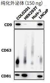 分别使用1 ng各种细胞的培养上清液来源纯化外泌体(使用MagCapture来源外泌体提取试剂盒 PS),外泌体标记蛋白CD9、CD63、CD81对应的抗体,进行表达分析。