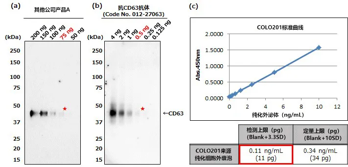 图(a),(b)为使用各种抗CD63抗体(其他公司产品,FUJIFILM Wako产品: 012-27063)进行免疫印迹的检测灵敏度数据