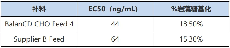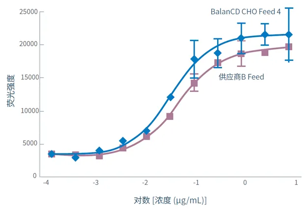图3. 从BalanCD CHO Feed 4和供应商B补料的分批补料培养物中收获的生物类似药的ADCC活性比较。通过ADCC报告生物法测定纯化抗体的活性,每个浓度一式三份。
