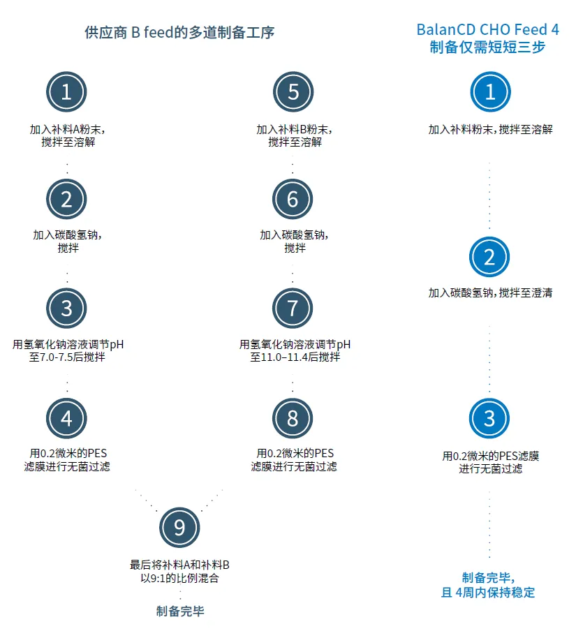 通常来说,营养丰富的补料都较难溶解,制备工序较为复杂且耗时长。BalanCD CHO Feed 4富含氨基酸和维生素,且溶解制备只需简单三步。基本无需调节pH值,pH值在培养物中保持稳定。