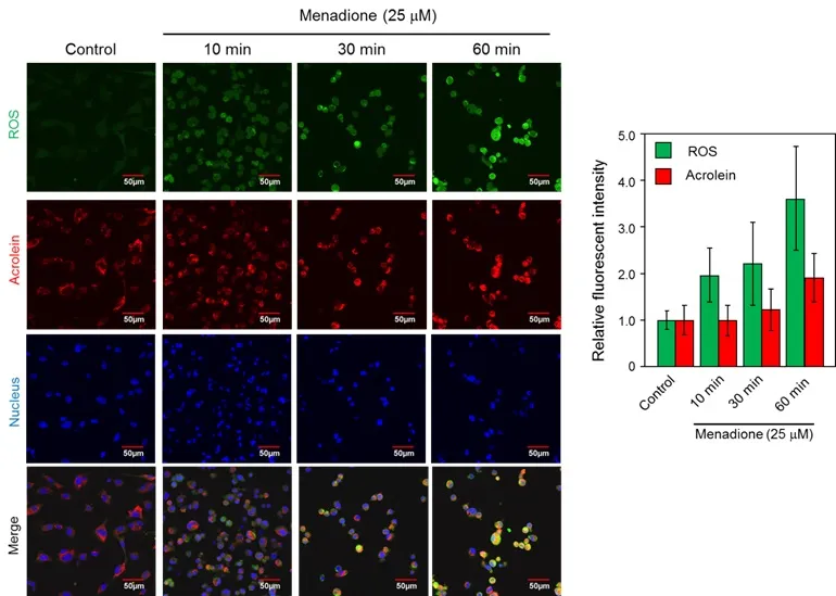 使用能促进细胞内活性氧(ROS)产生的物质甲萘醌对细胞处理0、10、30、60 min后,分别使用ROS检测试剂以及AcroleinRED进行共染色。可观察到经甲萘醌处理后,细胞的ROS迅速增加,而丙烯醛则是缓慢增加。