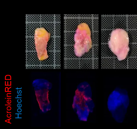结果表明,AcroleinRED处理过的乳腺癌组织(IDC,DCIS)中可以观察到红色荧光,但正常乳腺癌组织(NBG)却基本无法观察到经过AcroleinRED处理的染色。通过这种方法,可以对非固定状态下的提取组织进行染色。
