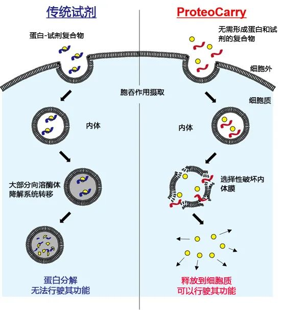 虽然已经开发了许多基于肽、阳离子的脂质或聚合物的蛋白转染试剂,但它们都是与蛋白形成复合物后,通过胞吞作用摄入细胞内,破坏内体膜将其运送至细胞质。然而,现有的大部分试剂内体膜的破坏活性低,并且从内体逃脱不足,导入的蛋白大部分都转移至溶酶体降解系统。