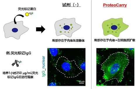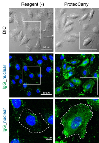 图2是导入荧光标记IgG的案例。不添加转染试剂时,以内体/溶酶体的染色为主,从细胞质中无法获得荧光信号,与之相对的,可以观察到在本产品案例中,内体、细胞质被大面积染色。(详情请参照应用实例)