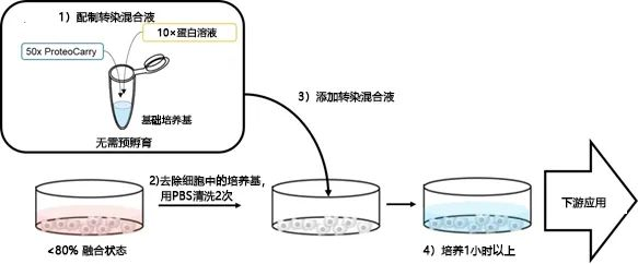 1. 向新鲜的培养基(无血清培养基,10% 以下含 FBS 培养基或 PBS)添加本产品以及想要导入的蛋白。(配制转染混合液)。