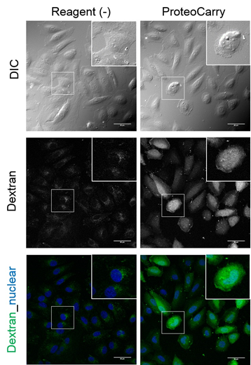 本产品是将蛋白以及葡聚糖等生物大分子导入细胞内,尤其是导入细胞质的试剂。传统的蛋白转染试剂存在蛋白滞留在内体或溶酶体中的问题,但是由于本产品可以高效地将蛋白运送至细胞质,可以广泛地适用于在评价导入蛋白的细胞内功能和抗体导入引起的功能抑制诱导等的实验。另外与传统产品不同的是,本品无需与蛋白进行预孵育,所以不会形成复合体,低限度地限制其对蛋白功能的影响。