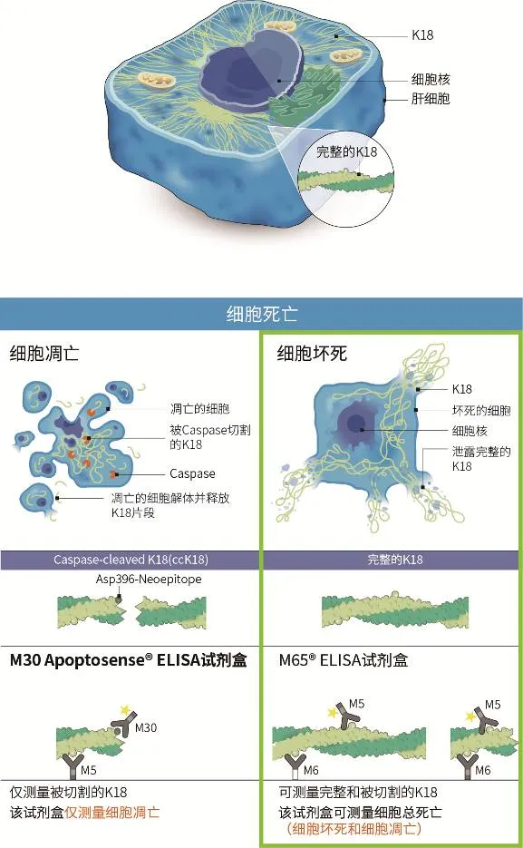M5和M6角蛋白18抗体可与不受caspase酶切割影响的K18的表位结合,从而可检测K18的总水平。因此这两个抗体可检测细胞总死亡(细胞凋亡和细胞坏死)。