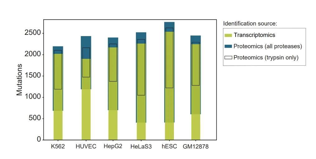 图4. 检测到的SAP的性质,各细胞系中转录组学和蛋白质组学对于SAP的检测。不同组学,不同酶解方式鉴定到的数目