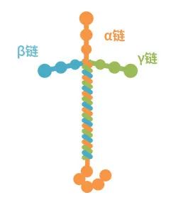 层粘连蛋白(Laminin)是一种分子量约为900 kDa的糖蛋白,由α、β和γ三个糖链聚集在一起形成十字结构。α链、β链和γ链分别存在多个分子种类,层粘连蛋白的类型根据其组合方式来命名(例如,α1、β1和γ1组成的层粘连蛋白称为层粘连蛋白-111)。