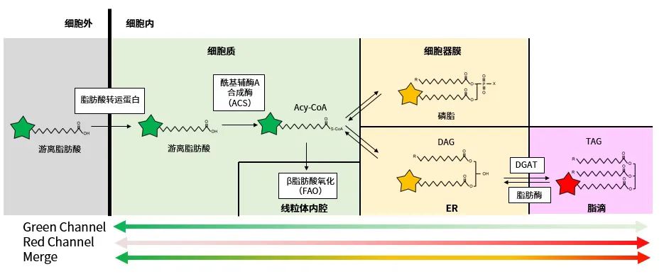 ● 根据脂肪酸代谢和细胞器环境的不同,荧光颜色呈绿色~红色变化。