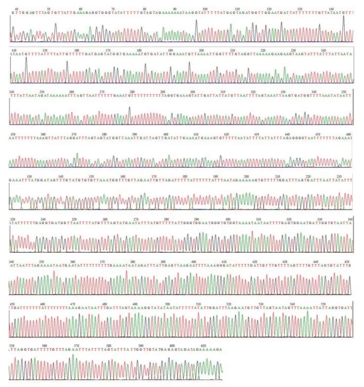 以Lambda DNA为模板,通过使用该试剂盒和DNA聚合酶在Bisulfite反应后,扩增910 bp目的区域,分析碱基序列。Lambda DNA中所有的胞嘧啶都是非甲基化,Bisulfite反应后全部被转化为尿嘧啶,预测PCR扩增产物中不存在胞嘧啶。