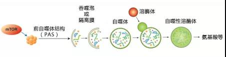 胞内物质被扩大的膜囊包裹,吞噬泡形成双层膜囊泡,成为自噬体。自噬体外膜随后与溶酶体融合,和内部物质被自噬性溶酶体降解。自噬的各种调节因子也被描绘于图中。