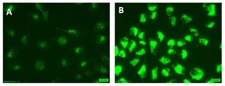 (A) 完全培养基 (B) 在饥饿培养基 (EBSS)中添加40 µM Chloroquine培养4 h 。在含有Chloroquine 的EBSS培养基中培养的细胞表现非常明亮的绿色荧光信号和点状结构。