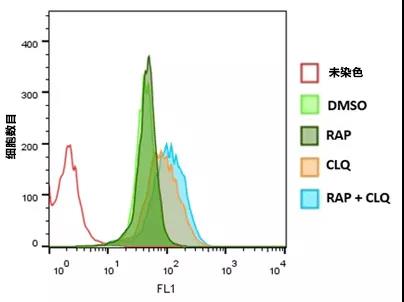 通过0.5 µM Rapamycin (RAP), 10 µM Chloroquine (CLQ)处理或不处理Jurkat细胞,或两者一起处理20 h。CYTO-ID® Green Detection Reagent 2染色30 min后,洗脱,用流式细胞仪分析。直方图叠加呈现结果。用RAP+CLQ处理细胞显示荧光有升高。