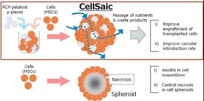 据报告,CellSaic的基本特征有 i). 提高移植细胞存活率ii). 提高血管导入率;iii). 细胞因子释放的变化