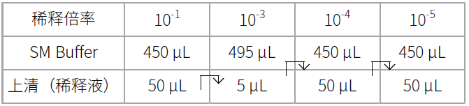 ① 稍微离心(3,000×g,5ec)包装反应后的噬菌体液,沉降残留,使用SM Buffer 105倍(100,000倍)稀释4)上清。